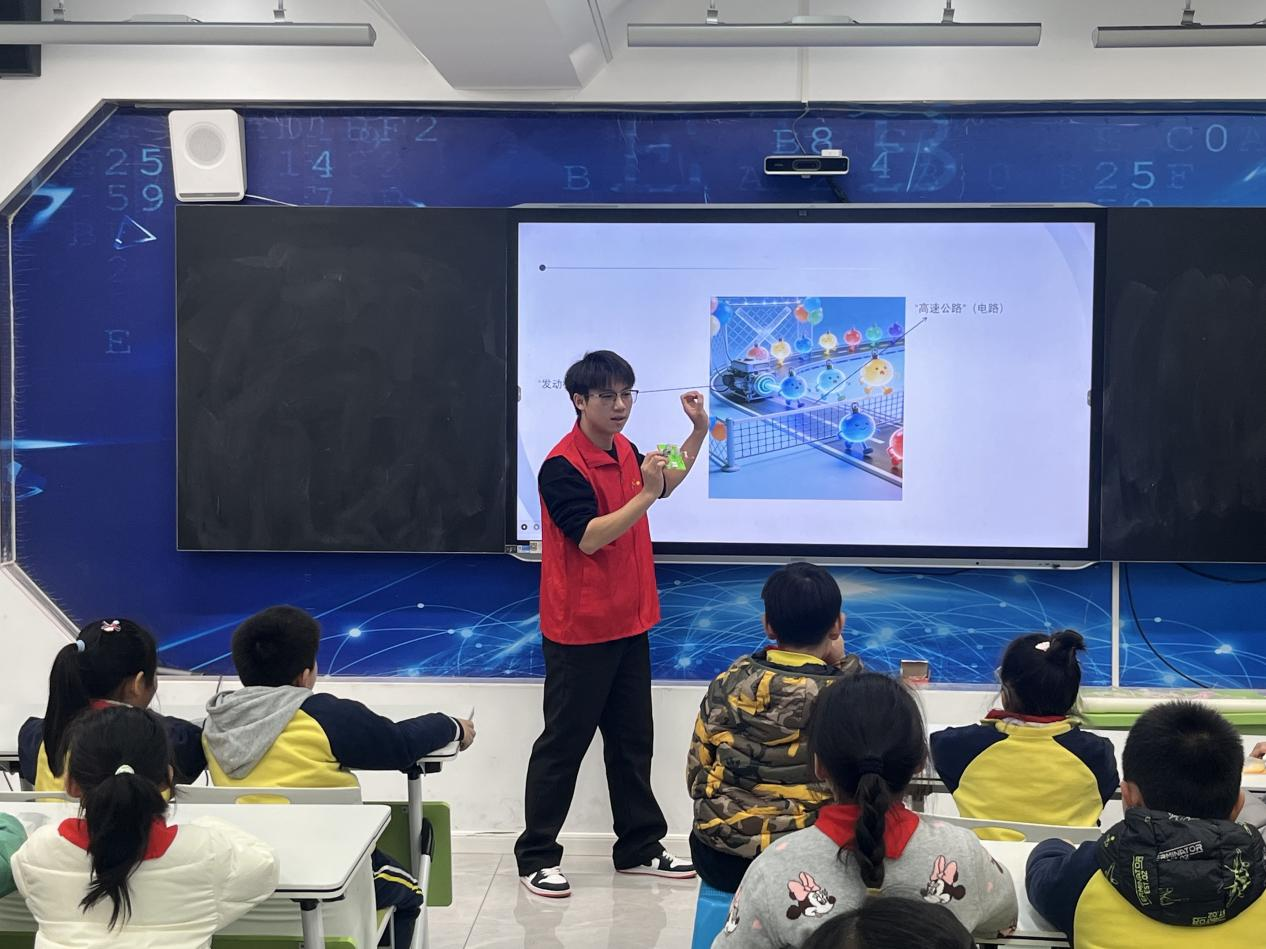 本网讯(通讯员 陈旭麒)12月22日下午,伟德国际victor·1946源自“星电领航”志愿服务队走进光谷二小开展科普进校园活动。活动以“安全用电,捕捉电精灵”为主题,通过趣味讲解、互动实验和手工制作,让小朋友沉浸式学习科学知识,提高安全意识。伟德国际victor·1946源自团委指导老师陈旭麒、学院12名志愿者、光谷二小50余名师生参加活动。