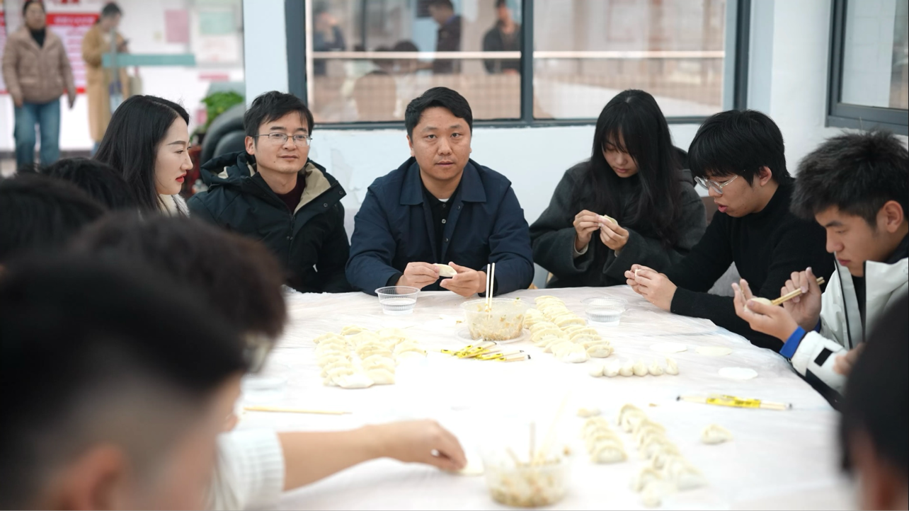 在包饺子区域,谢春晖为同学们讲解冬至所蕴含的“团圆祈福”深厚文化寓意,向大家送上了诚挚的节日祝福。各位老师化身“厨艺导师”,手把手地教同学们包饺子的技巧,“包馅的时候要适量,捏褶的时候要从边缘往中间推,这样捏出来的饺子既好看又牢固”。在老师的指导下,同学们越来越熟练,包出的饺子也越来越圆满。案板上,一个个形态各异、充满创意的饺子排满了托盘。大家一边传授包饺子技巧,一边交流校园学习生活,在轻松愉快的氛围中打破沟通壁垒,密切了师生联系。
