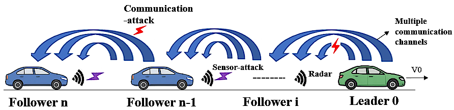 本研究面向网联自动驾驶车辆编队在多种攻击场景下面临的安全控制问题,提出了一种融合VSS与TinyMPC的分层式Secure-TinyMPC框架。通过在安全层采用多信道可验证秘密共享机制,实现车队状态信息可信重构以及通信攻击、传感器攻击的实时检测;在控制层采用基于ADMM与LQR的轻量化模型预测控制方法,实现对车辆编队间距和速度的快速稳定调节。最后,通过多组实验验证了所提方法的有效性,结果表明该方法在多类网络攻击和传感器篡改下仍能够有效维持车队稳定性,并实现对攻击的实时检测与估计,且在计算效率和控制性能方面均表现出良好优势。
