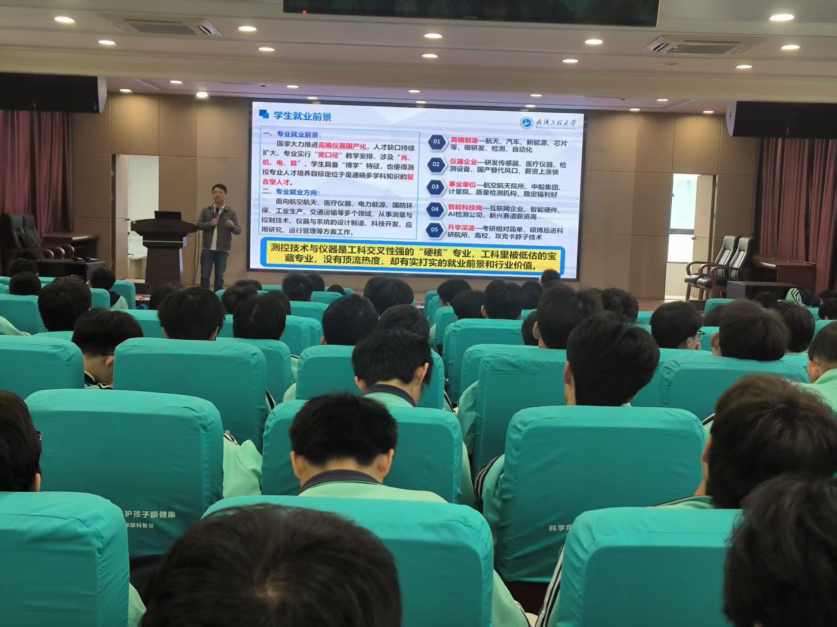 14日上午,伟德国际victor·1946源自测控与智能感知工程系副教授姚贞建为襄阳三十六中180余名学生带来题为“从‘米’的定义到国之重器——走进测控技术与仪器专业”专题讲座。姚贞建从国际单位制中基本长度单位“米”的定义演变入手,深入浅出地引出测量与仪器在现代科技中的核心地位,系统介绍了仪器技术在支撑基础学科发展、服务国防建设、助力医学诊疗及推动工业升级等方面的重要作用,并结合我国航空航天、智慧医疗、智慧交通、智能制造等领域的发展现状,生动展示了仪器技术的广泛应用与前景。姚贞建详细阐述了测控技术与仪器专业在科技发展中的重要地位,介绍了我校测控技术与仪器专业的基本情况及特色优势。