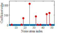图2. 利用复合字典进行稀疏分解:(a)测量信号的重构结果,(b) FAHP字典系数,(c)风噪声字典系数